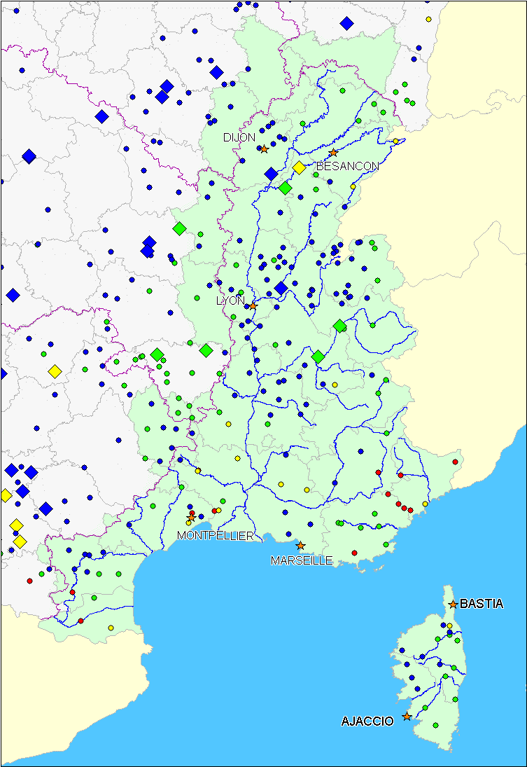 Les stations contrôlant des bassins versants de plus de 2000 km2, sont représentées par des losanges et non des cercles.