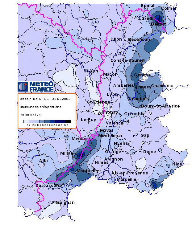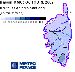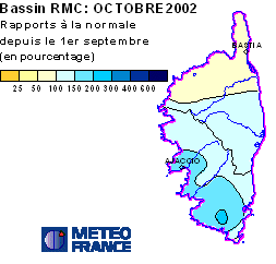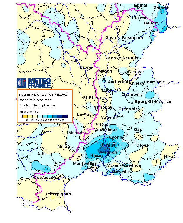 Accueil du Bulletin du 12 novembre 2002 SITUATION CLIMATIQUE Echelle régionale Précipitations brutes Précipitations efficaces COURS D'EAU Débits Qualité Situation piscicole EAUX SOUTERRAINES BARRAGES RESTRICTIONS D'USAGE | PRECIPITATIONS BRUTES |  | Explications : Précipitations brutes, Rapport à la normale, Année hydrologique Hauteur des précipitations brutes | En octobre, le cumul pluviométrique est très variable d'une zone à l'autre. Du 8 au 10 octobre, le sud-est de la France connaît un épisode de fortes précipitations dans le Gard, les Bouches-du-Rhône et le Var : on relève 169,2 mm à Bormes-les-Mimosas (Var) le 9, et 99,8 mm le 10. Du 16 au 18 octobre, une zone pluvieuse s'étend sur une ligne Drôme-Jura, provoquant des pluies abondantes, notamment en Isère et dans le Jura. Un autre épisode marquant : le 30 octobre dans l'Aude avec 136 mm recueillis dans la commune de Mailhac. Par ailleurs, on note un cumul pluviométrique déficitaire dans certains départements comme dans la Loire et la Saône-et-Loire. | |  | Rapport à la normale du cumul des précipitations brutes depuis le 1er septembre | En octobre, le rapport à la normale est toujours aussi contrasté, marqué par l'épisode pluvieux des 8 et 9 septembre. Les zones déficitaires sont localisées dans les Pyrénées-Orientales, l’Aude et une partie de l'Ardèche pour le sud du bassin, dans la Loire, la Bourgogne et le Jura pour le nord. Partout ailleurs le rapport est proche des normales voire excédentaire. | |  |  | Action concertée dans le cadre du Réseau de Bassin Rhône-Méditerranée-Corse | |